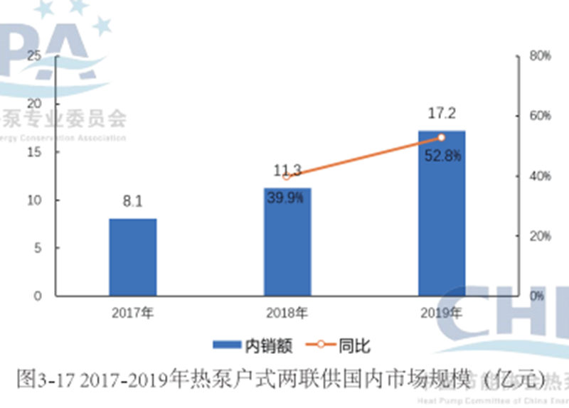 据中国节能协会热泵专委会数据显示,空气源热泵冷暖两联供产品在热泵细分市场中,成为近三年来增长最快的细分产品。高速增长的动力源于夏热冬冷及更大范围的南方地区对冬季舒适采暖的迫切需求,空气源热泵两联供恰恰满足了这一需求,一直呈现快速增长的趋势,2019年市场规模达到17.2亿元,增幅达到了52.8%。